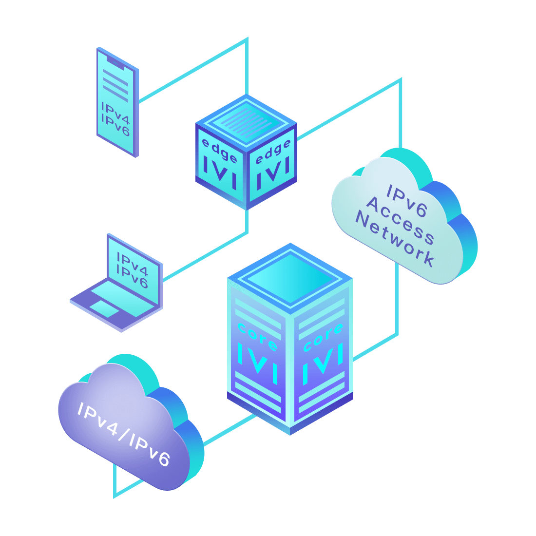 對正在進(jìn)行IPv6整體升級規(guī)劃的運(yùn)營商,應(yīng)用IPv6升級方案2.5,通過IVI無狀態(tài)翻譯技術(shù)和純IPv6接入網(wǎng)絡(luò),為雙棧客戶端和雙棧服務(wù)器提供連通服務(wù)。